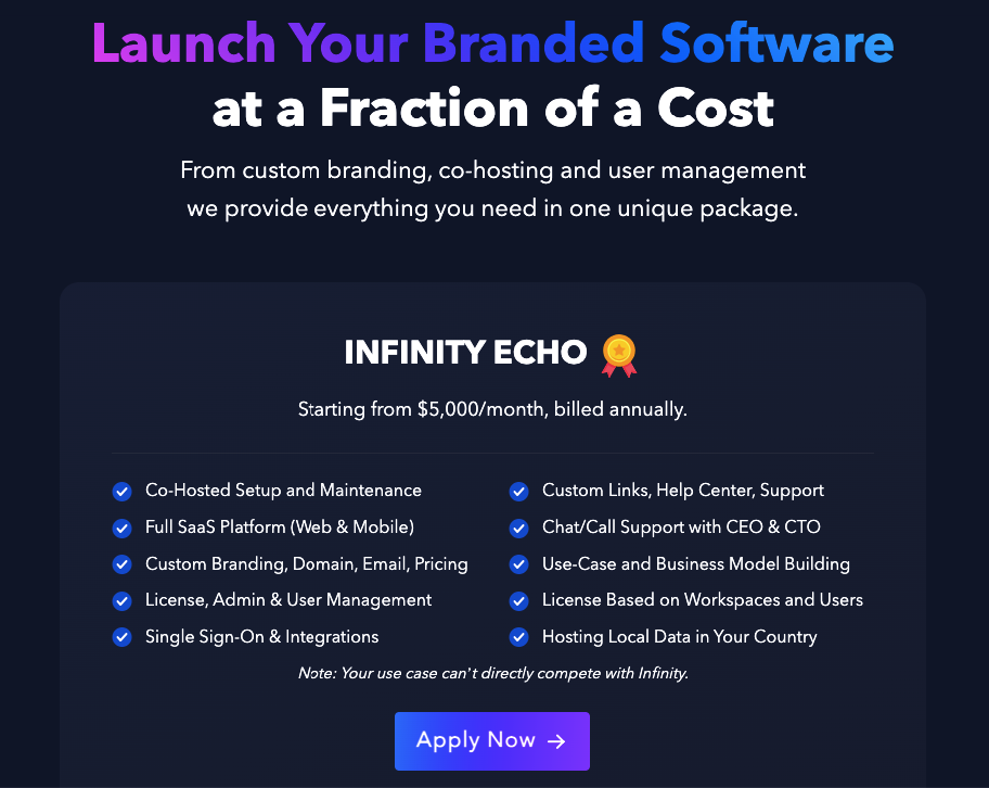 For enterprises and bigger companies, there is Infinity Echo which helps you launch your own branded software and templates in just a few weeks for $5,000 per month.